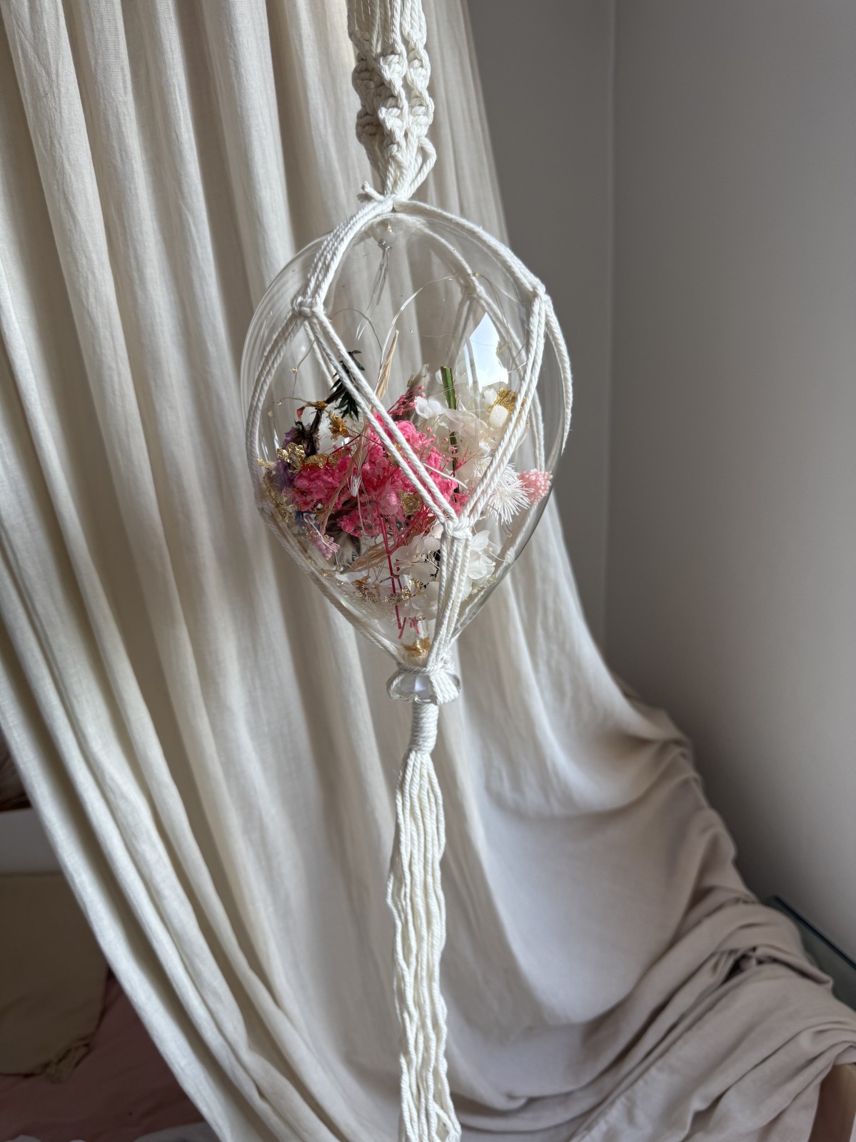 Grand Ballon fleurs séchées Macramé rose